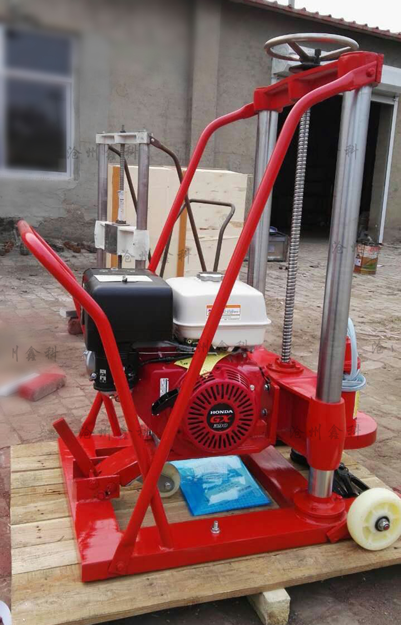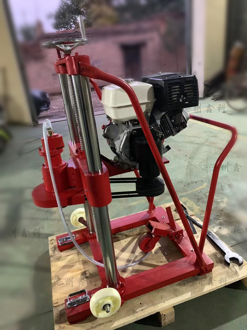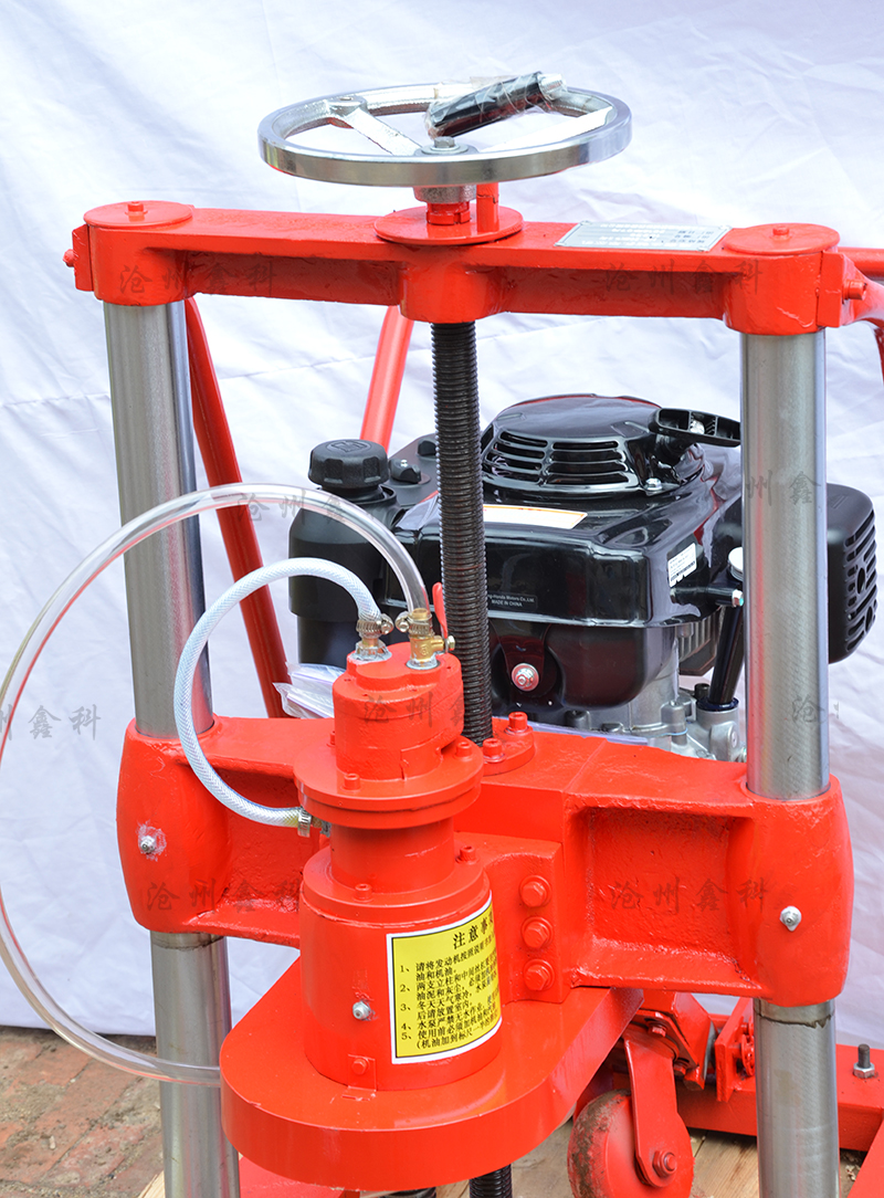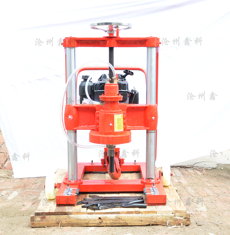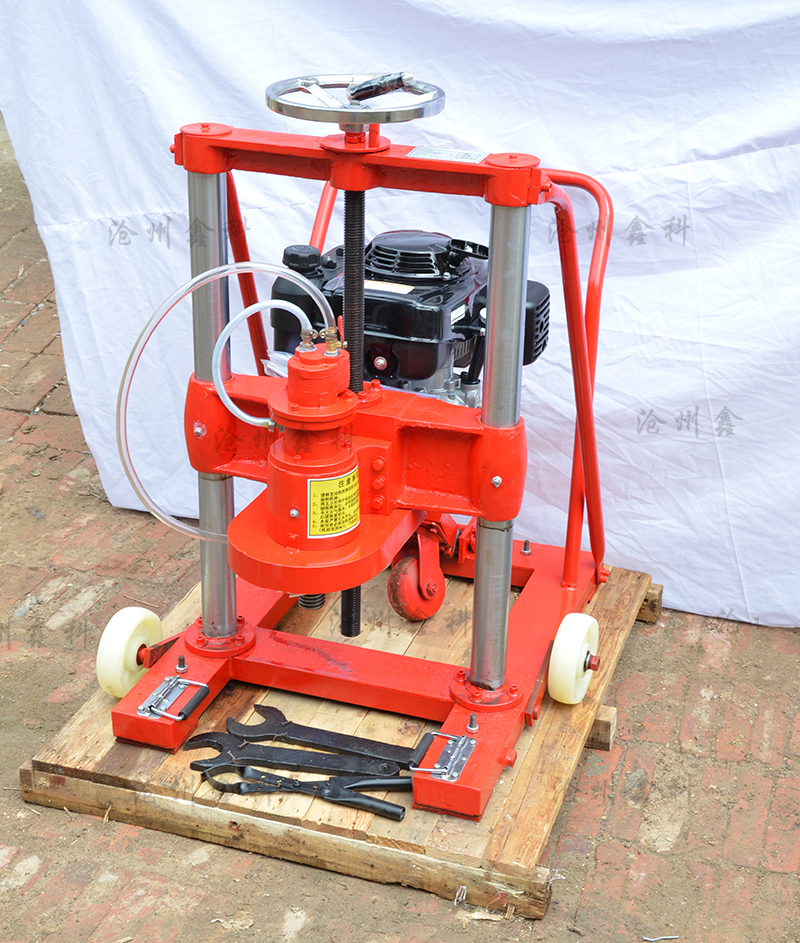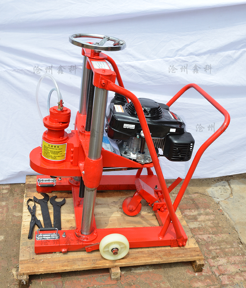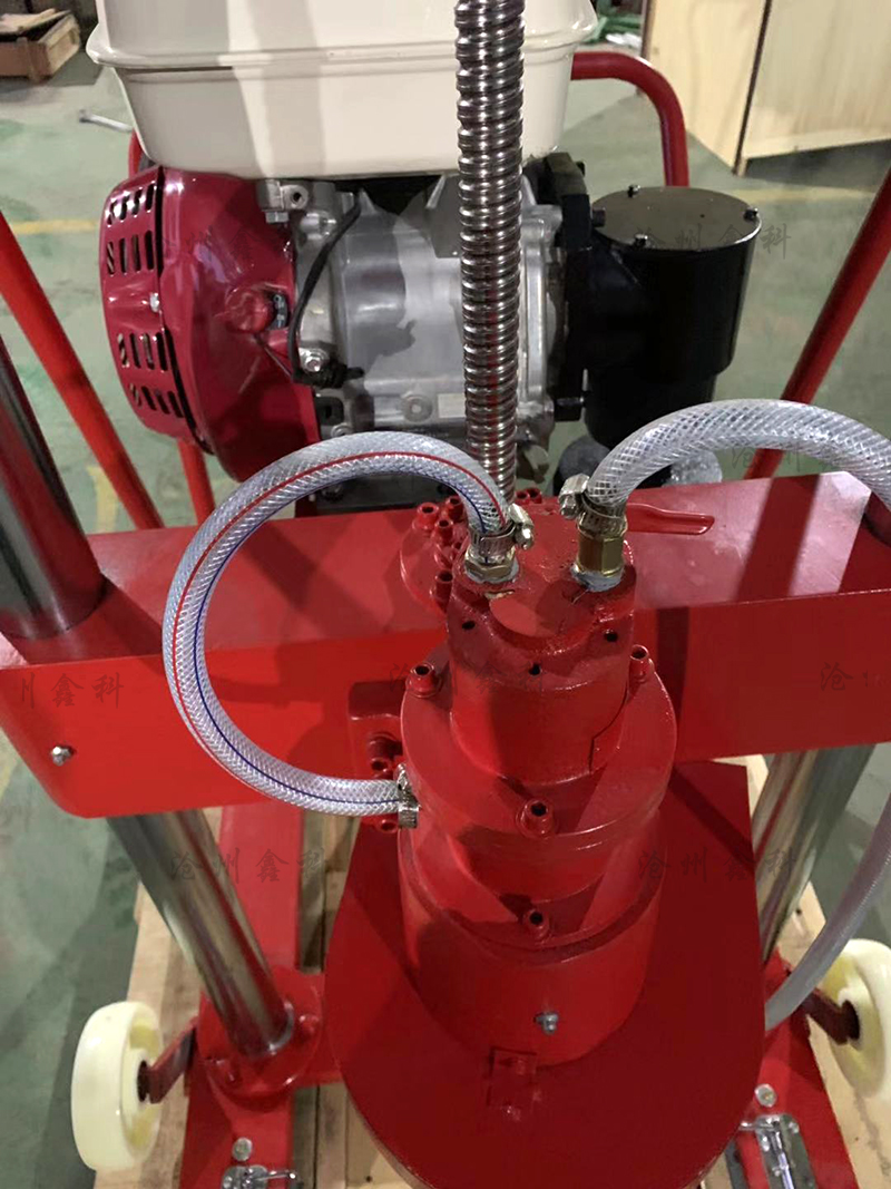5、開孔:以上作業(yè)做好后,即可開孔作業(yè),裝上鉆頭,起動汽油機(jī)(詳情見汽油機(jī)用戶手冊)把進(jìn)水管放入水桶內(nèi),水桶要提到高出水泵位置,然后手捏氣襄把水吸入水泵,水泵上水后把水桶放在地面即可。油門調(diào)至最大,開始輕搖給進(jìn)手柄,使鉆頭緩慢接觸地面。開孔要訣:先給水后鉆進(jìn),給進(jìn)速度要慢,鉆壓要小。嚴(yán)禁無水作業(yè),以免燒壞鉆頭和水封。