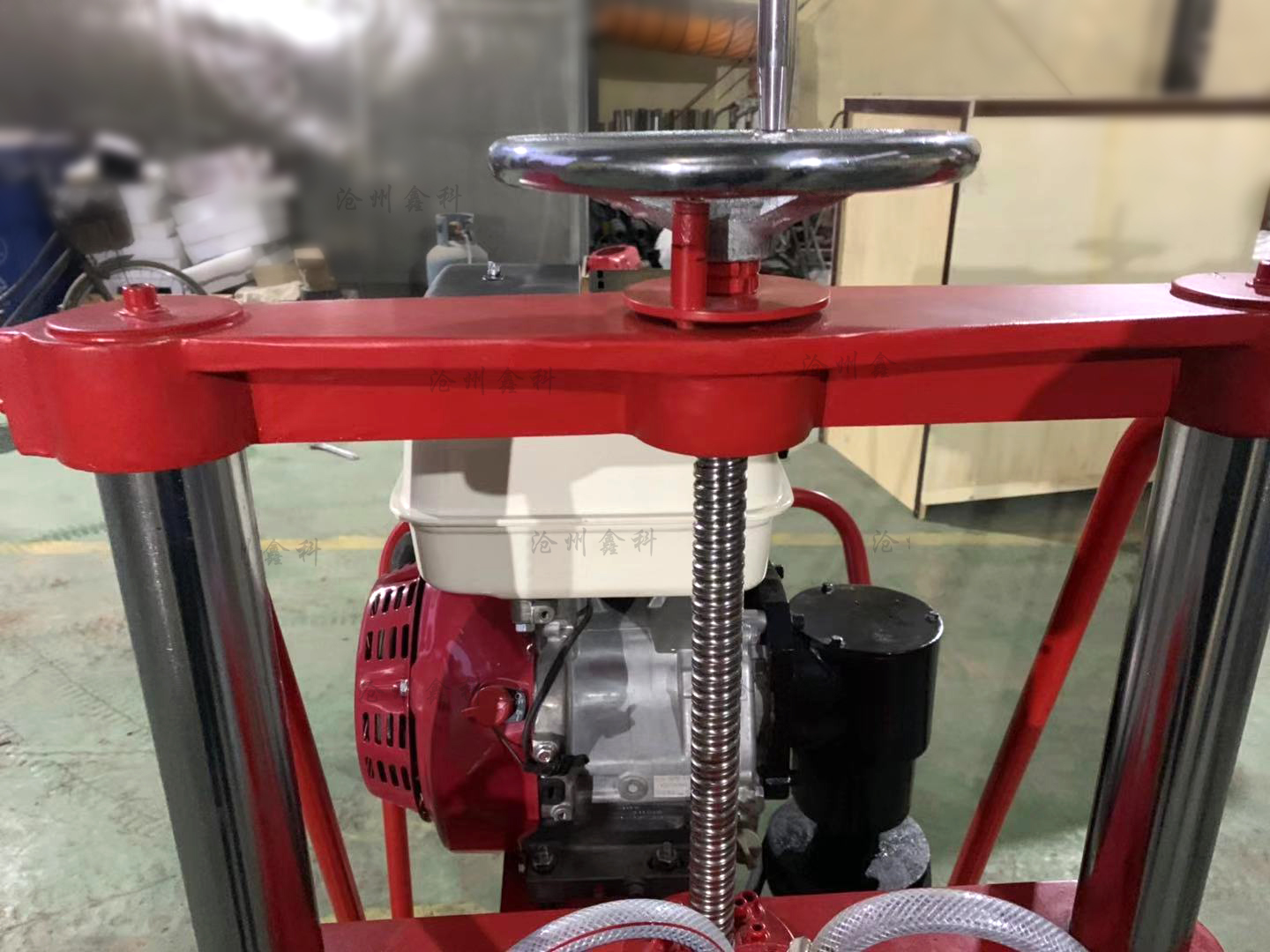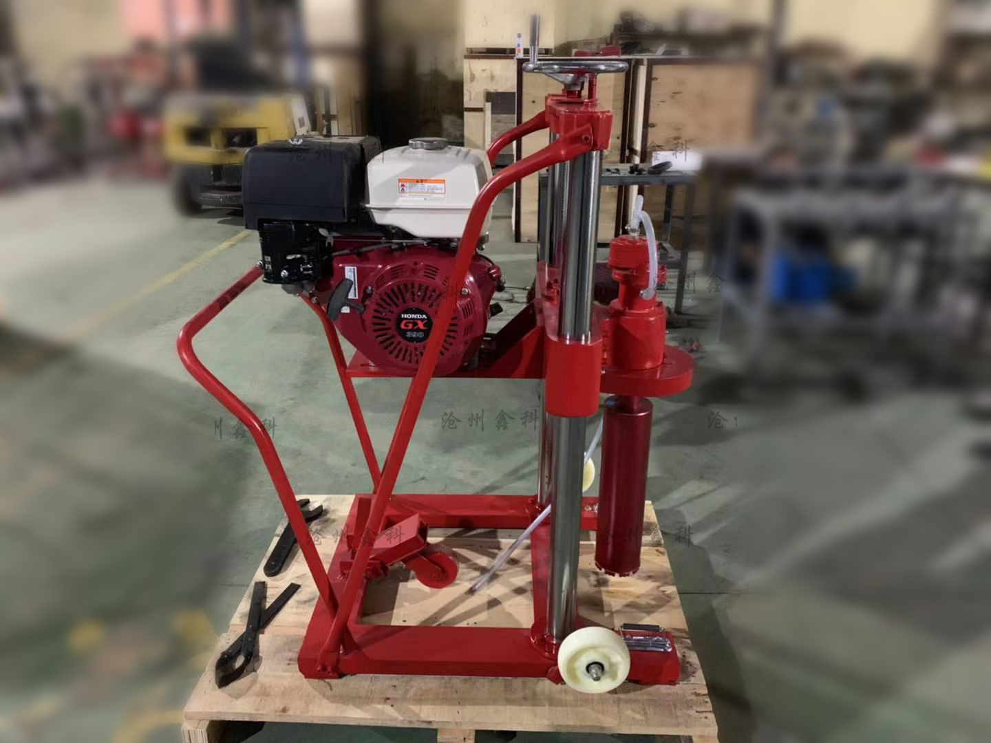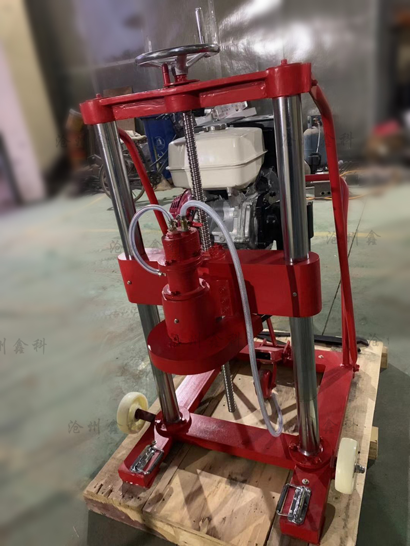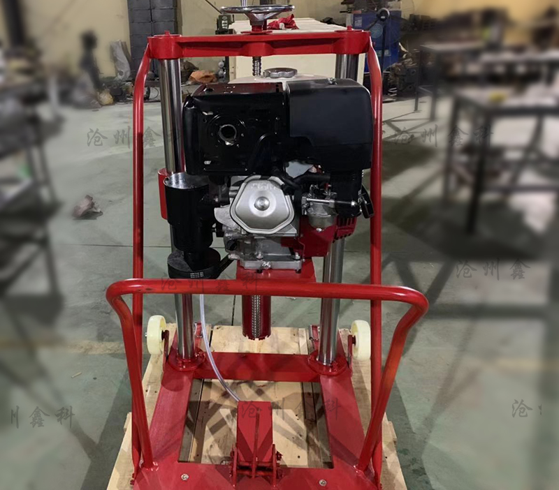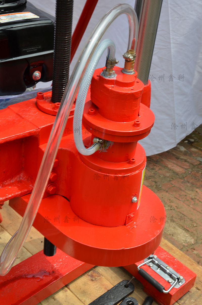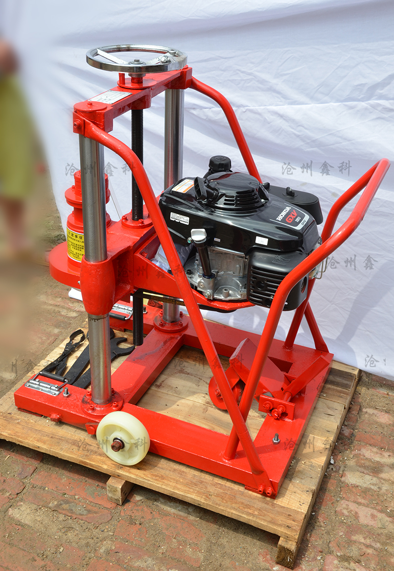 5、開孔:以上作業(yè)做好后,即可開孔作業(yè),裝上鉆頭,起動汽油機(jī)(詳情見汽油機(jī)用戶手冊)把進(jìn)水管放入水桶內(nèi),水桶要提到高出水泵位置,然后手捏氣襄把水吸入水泵,水泵上水后把水桶放在地面即可。油門調(diào)至最大,開始輕搖給進(jìn)手柄,使鉆頭緩慢接觸地面。開孔要訣:先給水后鉆進(jìn),給進(jìn)速度要慢,鉆壓要小。嚴(yán)禁無水作業(yè),以免燒壞鉆頭和水封。