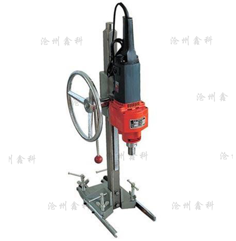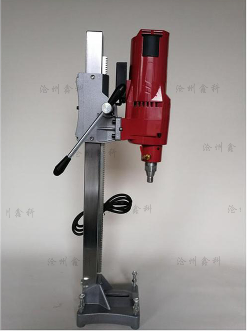 4、安裝:鉆頭對孔位后,把三個行走輪搬起,讓底座落到地面。打小孔且混凝土強(qiáng)度不高時,則依靠鉆機(jī)的自身重量就可將鉆機(jī)固定,若打的孔徑較大,鉆機(jī)自身重量不能穩(wěn)住鉆機(jī)時,可在底盤上放置重物(如砂袋、鐵塊、混凝土塊等)固定或打兩個膨脹螺栓加上壓桿(如槽鋼等)來固定鉆機(jī),鉆機(jī)固定要牢靠,不得搖晃,否則鉆孔作業(yè)無法正常進(jìn)行。